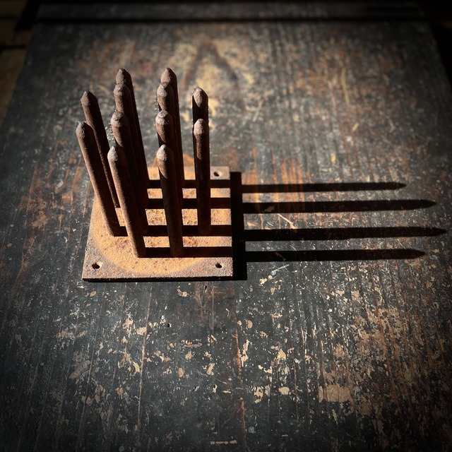 かつて練炭を成形するために使われていた、鉄の道具です。 一定の間隔で立ち上がる鉄の突起と、 重みのある正方形の台座。 用途を終え、時間を経たことで、 機能のための形は役目を離れ、 錆びた鉄の表情や、繰り返し使われた痕跡だけが 静かな造形として残されています。 ただ置かれることで成立する佇まい。 かつての仕事の気配を内に留めた、 鉄のオブジェとしてお楽しみください。 Materials: iron Size : 13×13 ×H13(cm) This iron tool was once used to mold briquettes. Its function has ended, leaving behind rusted surfaces and traces of repeated use. An object that stands simply by being placed. *商品の色味は、照明の関係で実物と多少の違いが生じることがありますが、ご了承ください。