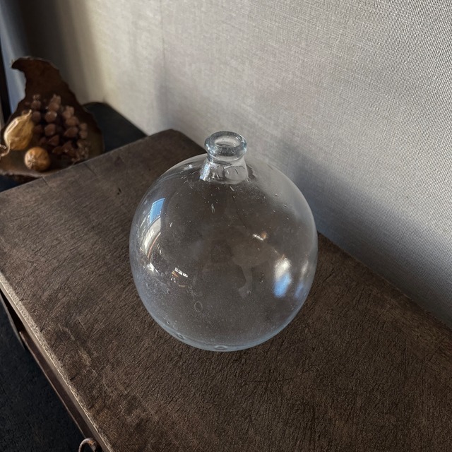 薄手のガラスを手吹きで成形した、古物の一輪挿しです。 丸くふくらんだ胴には、大小さまざまな気泡が無数に閉じ込められており、光を受けるたびに、ゆらりとした陰影を生み出します。 一部に経年による曇りが見られますが、長い時間を経た硝子ならではの表情としてお楽しみください。 草花を一輪挿すだけで、空間に静かな存在感を添えてくれる佇まい。棚や卓上、窓辺にも馴染みの良いサイズ感です。 手仕事の揺らぎと空気感を感じていただける一点です。 ※古物のため、気泡・歪み・曇り・微細な擦れ等がございます。あらかじめ風合いとしてご理解ください。 Materials:glass Size :Φ9× H11×(cm) A small antique glass bud vase, hand-blown with thin glass. Numerous air bubbles and subtle cloudiness create a soft, time-worn character. Its gently rounded form adds a quiet presence, even with a single stem. *商品の色味は、照明の関係で実物と多少の違いが生じることがありますが、ご了承ください。