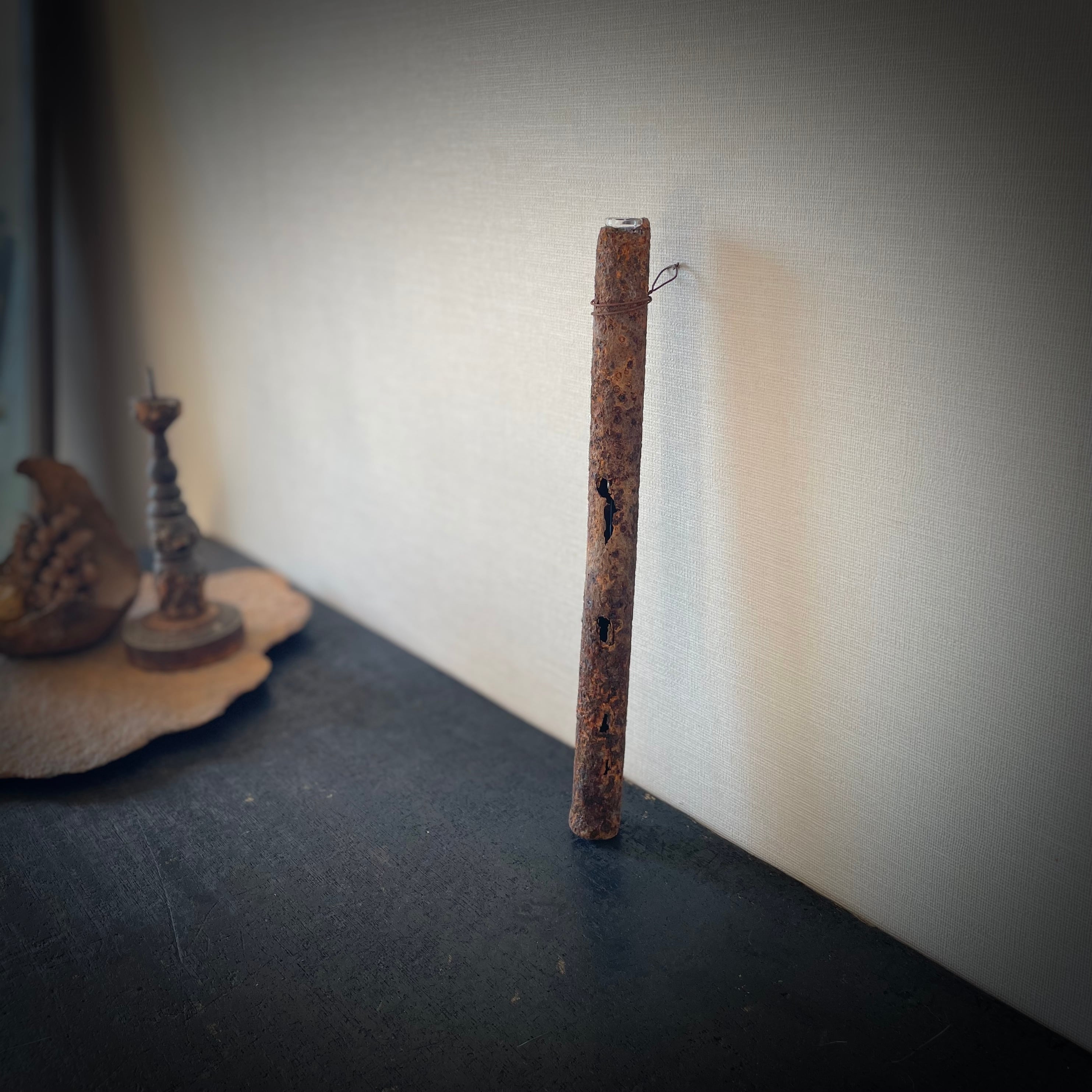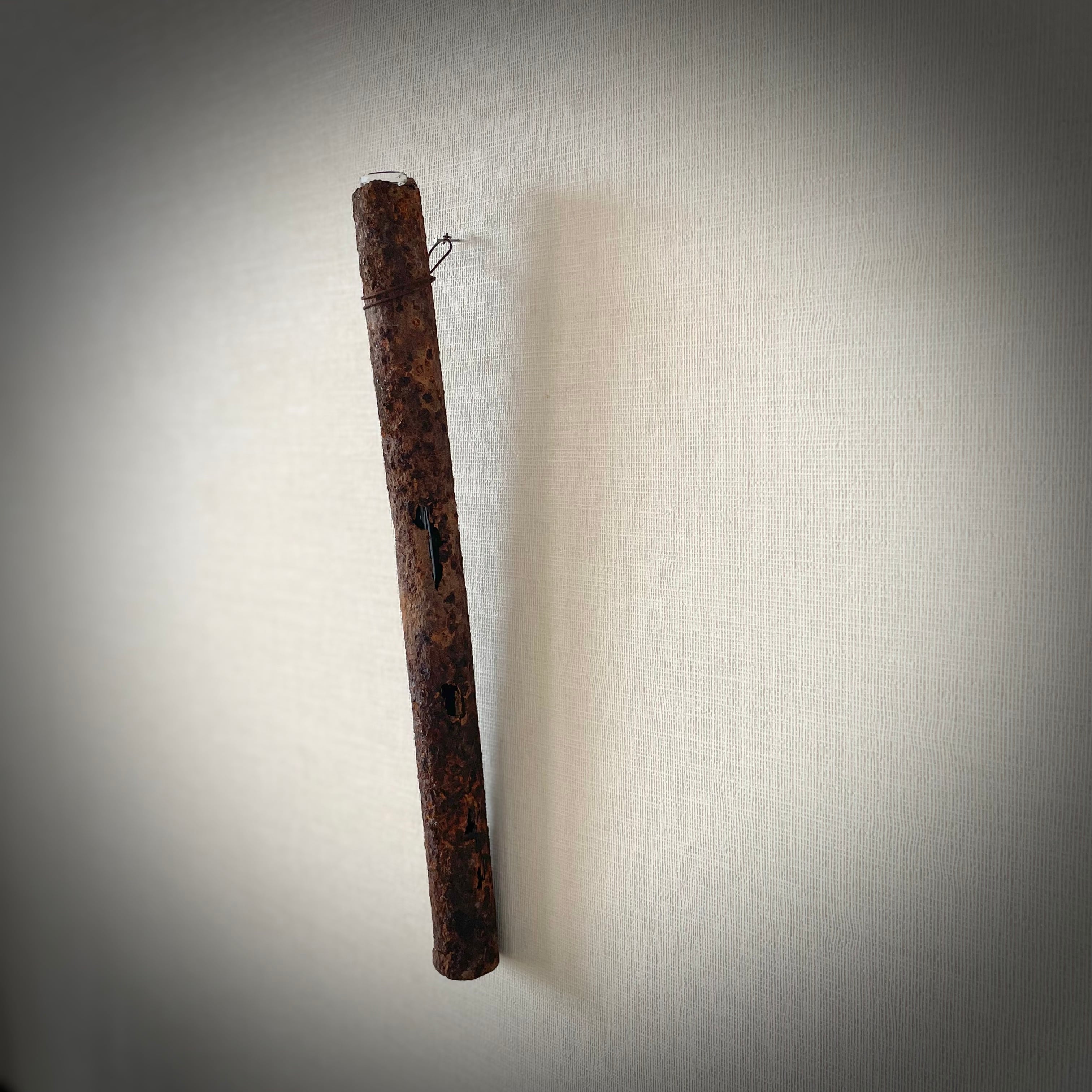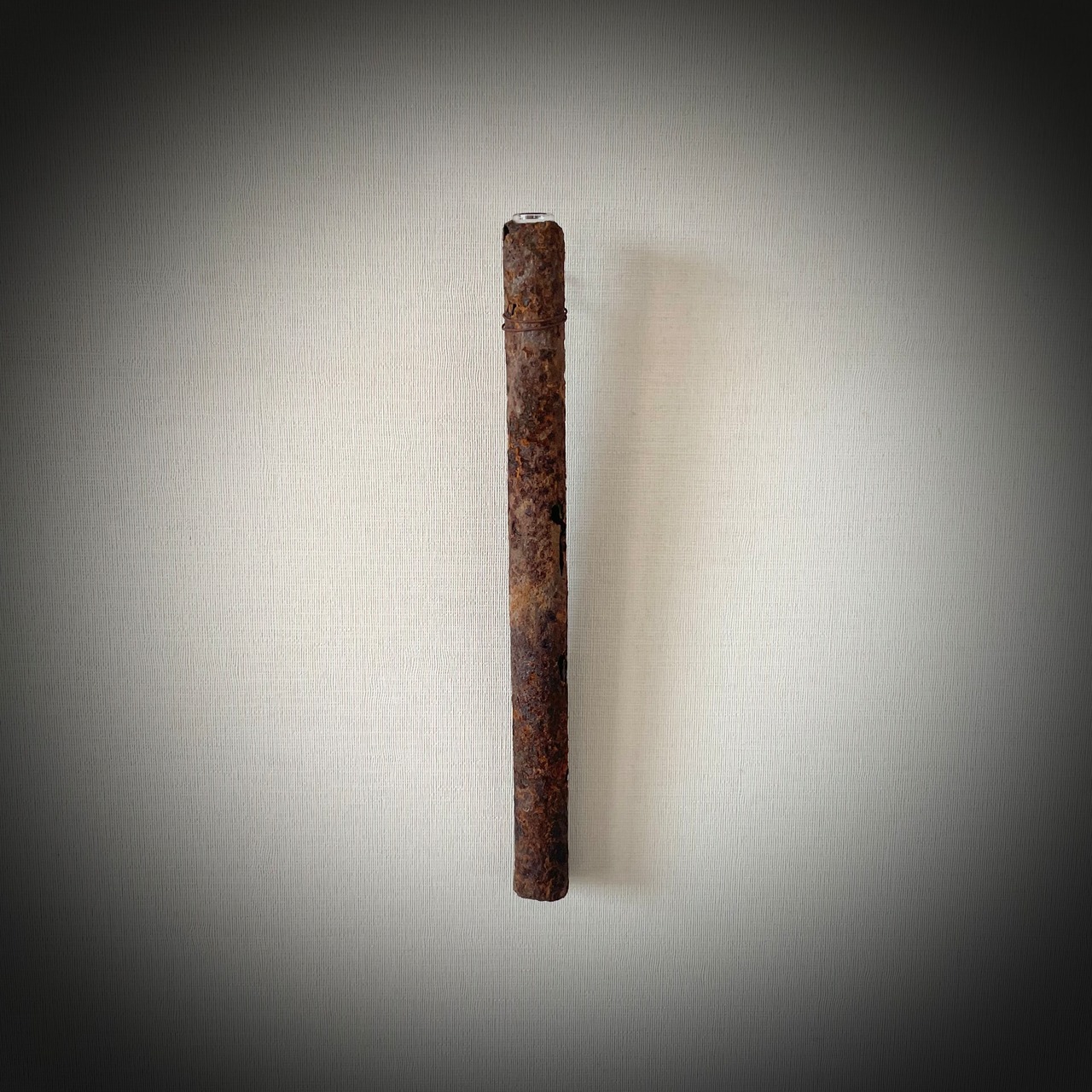 鉄製の管に、自然に生じた錆や欠損が残る古物です。
