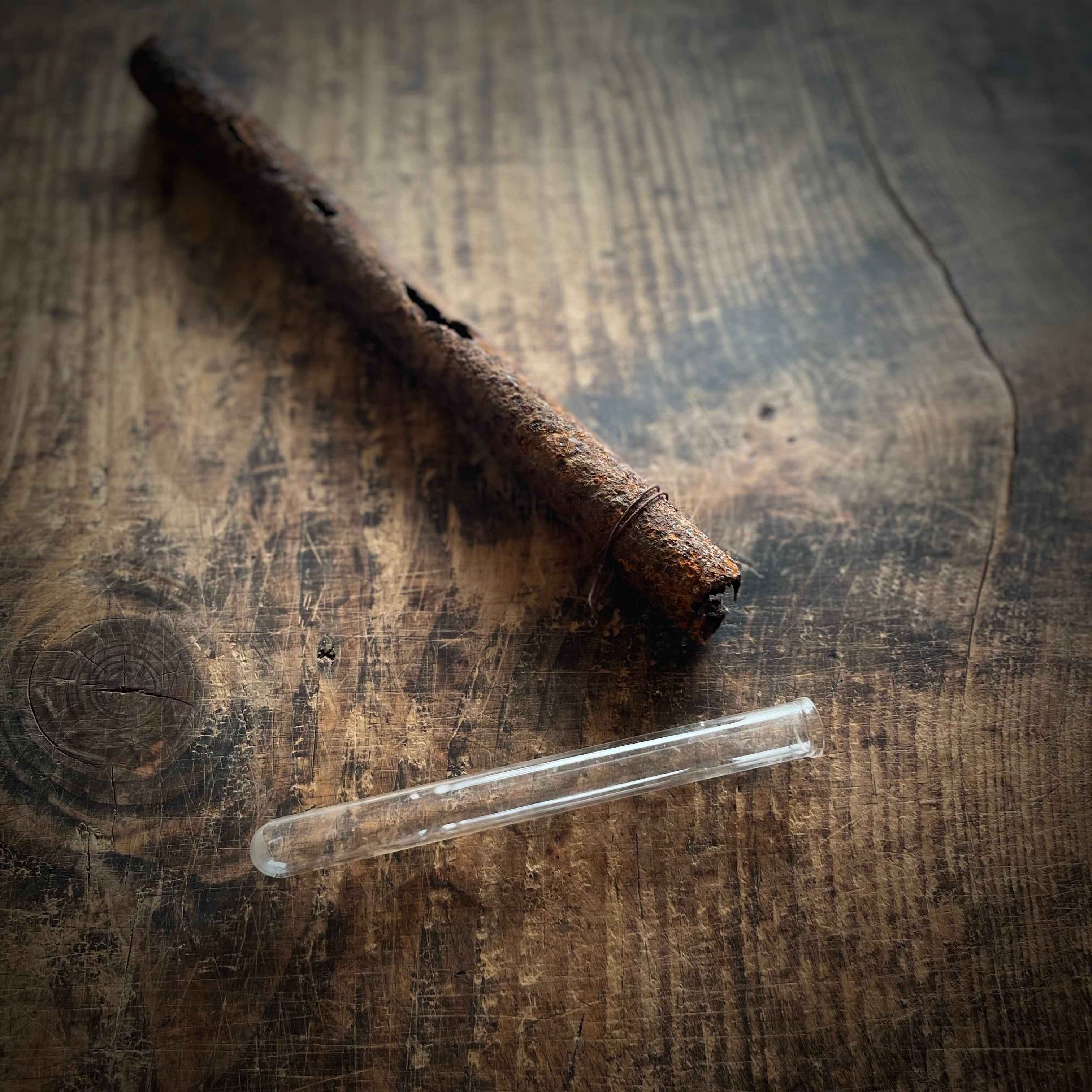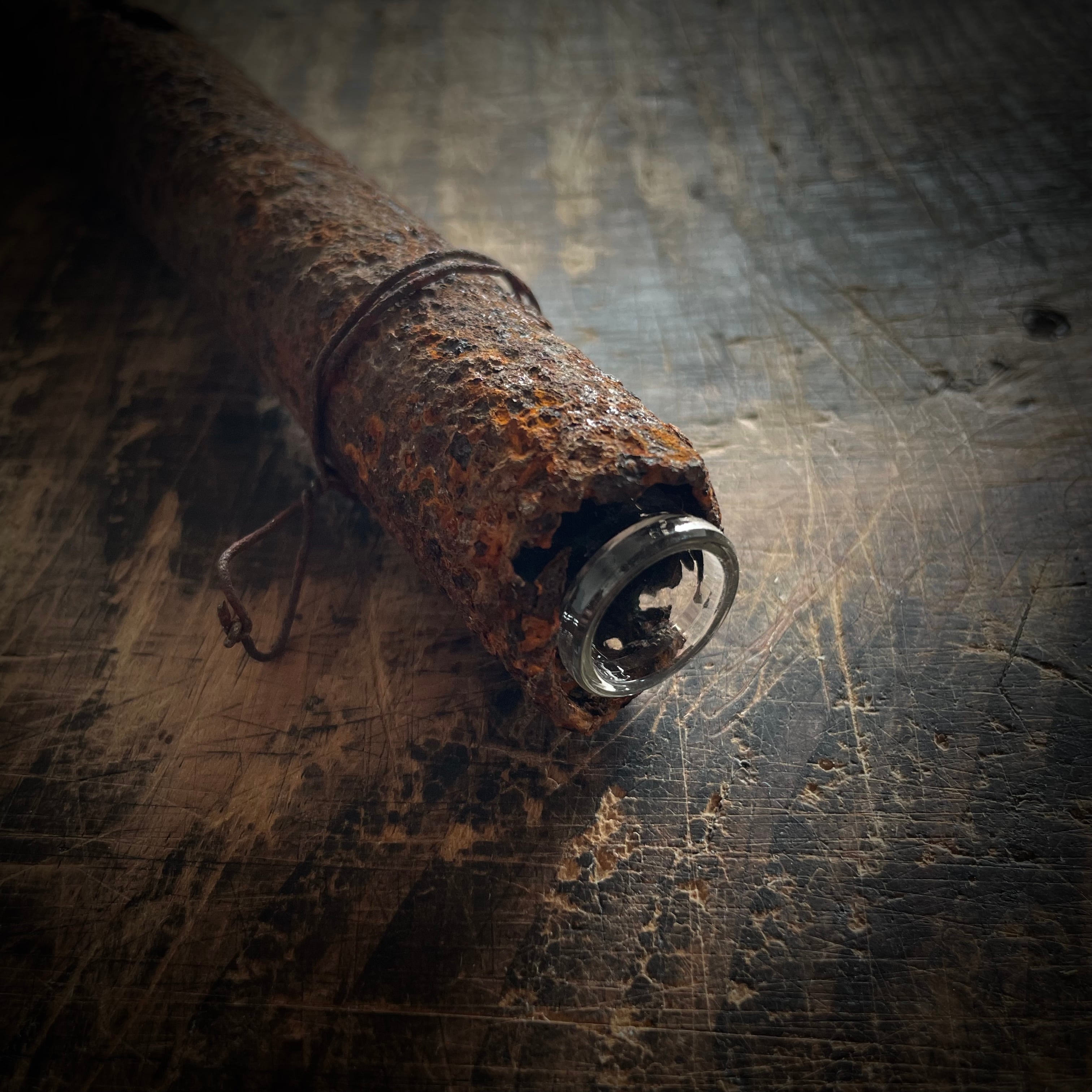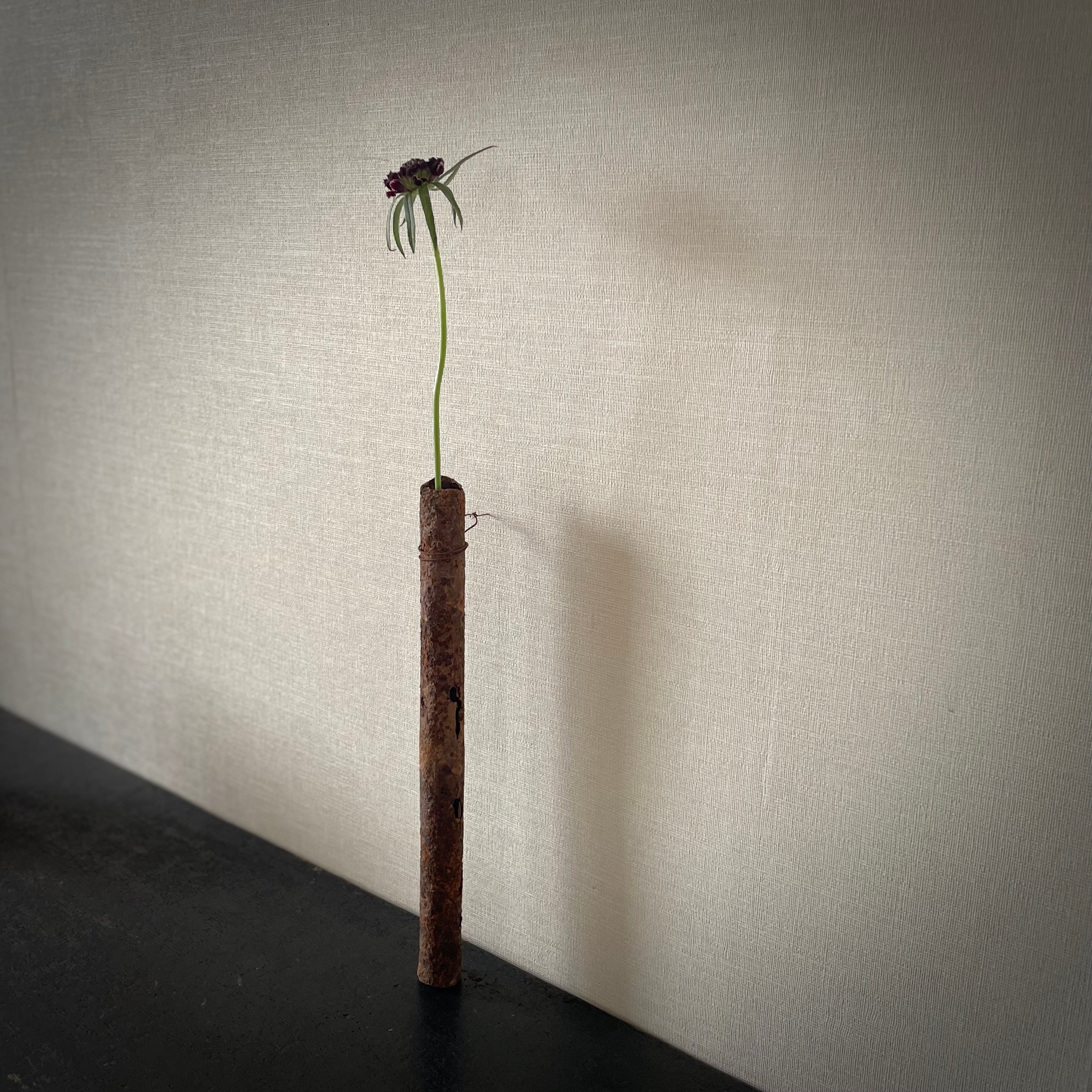 鉄製の管に、自然に生じた錆や欠損が残る古物です。